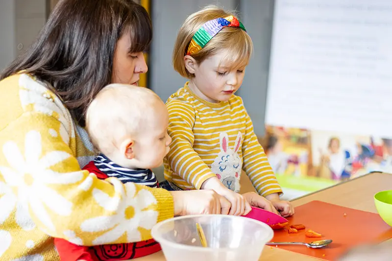 Cooking with young children is extremely rewarding for both child and adult, alike. You can start simply by just touching, tasting and talking about the ingredients. Be enthusiastic and excited at the new discoveries you both make. You can then move on to chopping and weighing  which helps develop their fine motor and number skills.